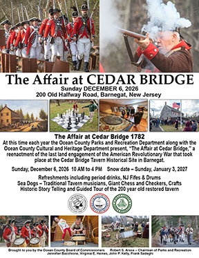 2019 Reenactment Photo GalleryVIDEO: “The Cedar Bridge Tavern Restoration Project”Historic Cedar Bridge Tavern, located on 5 acres and surrounded by Bass River State Forest, dates back to 1816. However, the history of the site reaches much further. It is rumored that the last skirmish of the American Revolution occurred here on December 27, 1782. With rehabilitation work completed on the historic Cedar Bridge Tavern in the Pinelands of Barnegat Township, Ocean County now welcomes visitors to a site that plays a part in its history.